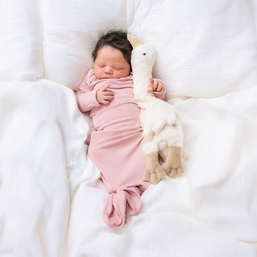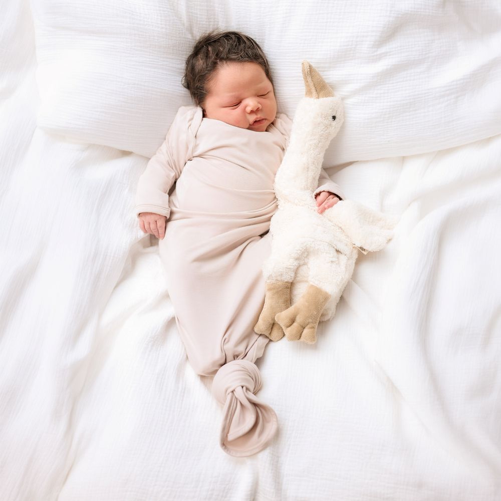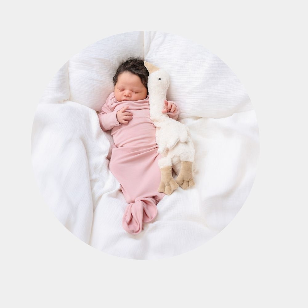 Der Knoten am unteren Ende erleichtert das Wickeln deines Babys ohne seinen Schlaf zu stören. Der lockere Schnitt bietet genügend Platz zum Strampeln und Strecken und unterstützt die gesunde körperliche Entwicklung.