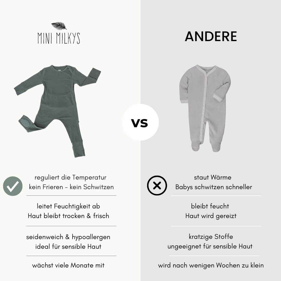 Andere Strampler: Stauen Wärme, bleiben feucht, reizen die Haut und passen oft schon nach wenigen Wochen nicht mehr. Das Ergebnis: Schwitzen, Frieren, unruhige Nächte.